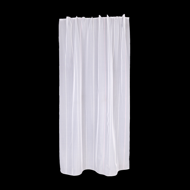 Voálová látka bílé barvy s růžovými a stříbrnými proužky, kterou můžete použít jako závěs či lehkou záclonu.