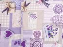 Hustě tkaná bavlněná látka s digitálním potiskem ze 100% bavlny. Bavlněná látka je v metráži o šíři 140 cm. Potisk je s motivem levandule se srdíčky v patchwork motivu.