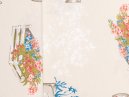 Režná látka s motivem bedýnek s květinami na světle béžovém podkladu.